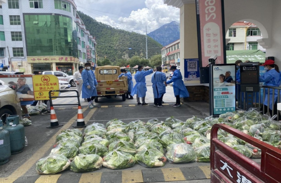 圖為:志愿者為居民清點(diǎn)蔬果送達(dá)家中