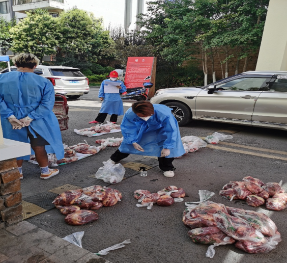 圖為:志愿者為居民清點(diǎn)肉食物資并送達(dá)家中